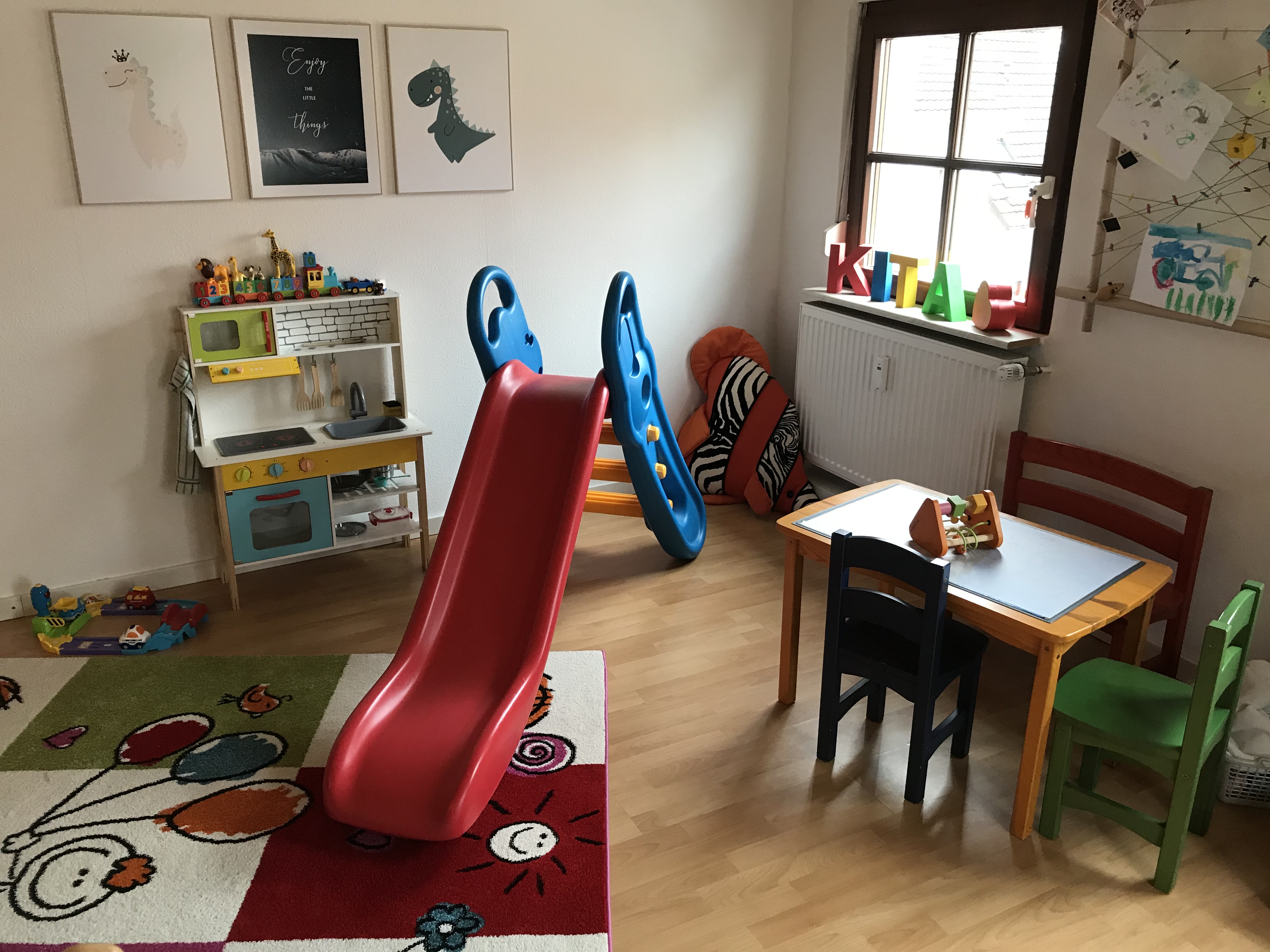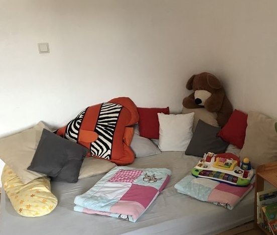 Zu Fuß sind innerhalb von zehn Gehminuten Spielplatz, Wald mit Bachlauf, Schwimmbad und Fußballplatz erreichbar. Parkmöglichkeiten sind in ausreichender Anzahl vor dem Haus verfügbar. In den ergonomisch und kindgerecht gestalteten Betreuungsräumen, können sich die Kinder frei entfalten. Sitz und Kuschelecke laden zum gemeinsamen Geschichten lesen ebenso ein wie das singen, spielen und basteln in den restlichen Quadratmetern. Schlafmöglichkeit gibt es für die kleinen natürlich auch, hierfür wurde eine Ruhezone mit „Nestchen“ geschaffen hier darf jedes Kind sein eigenes Kissen und seine persönlichen Utensilien die es in der Ruhephase braucht mitbringen und hinterlegen.