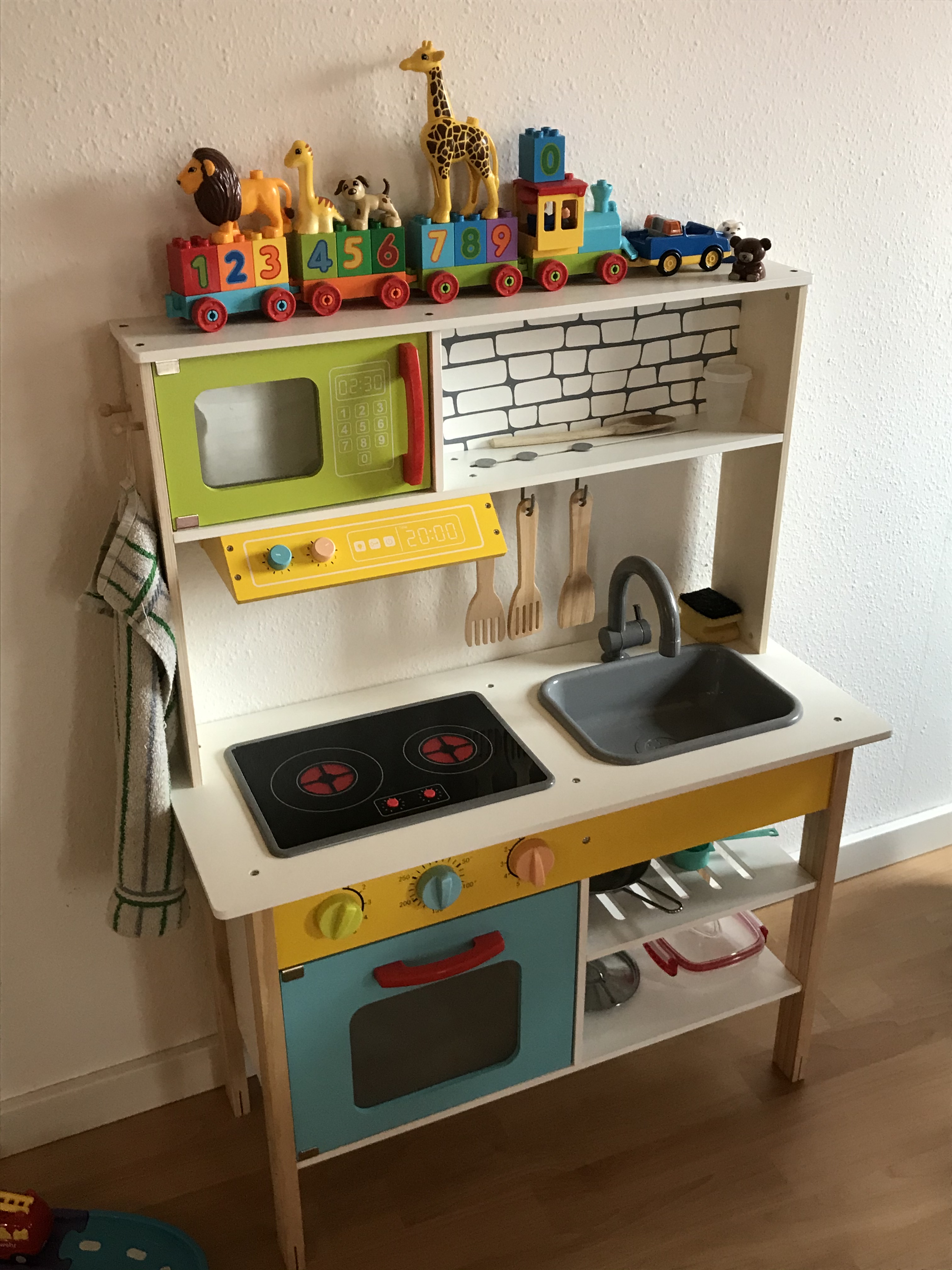 Das gemeinsame Frühstück und Mittagessen nehmen wir in der eingefassten Essecke zur Küche ein, wo jedes Kind seinen eigenen Platz bekommt. Hier wird frisch gekocht, gebacken und genascht.